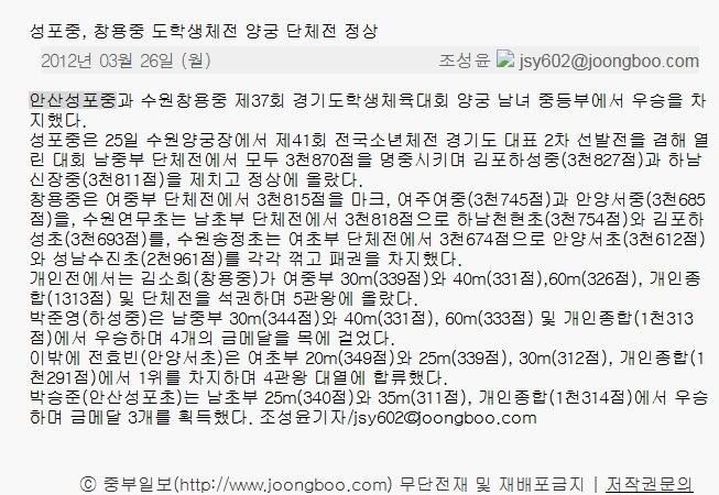 성포중, 창용중 도학생체전 양궁 단체전 정상