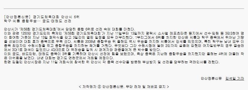 [안산정론신문] 경기도체육대회 안산시 6위 / 탁구·씨름 종합우승… 궁도·태권도 선전