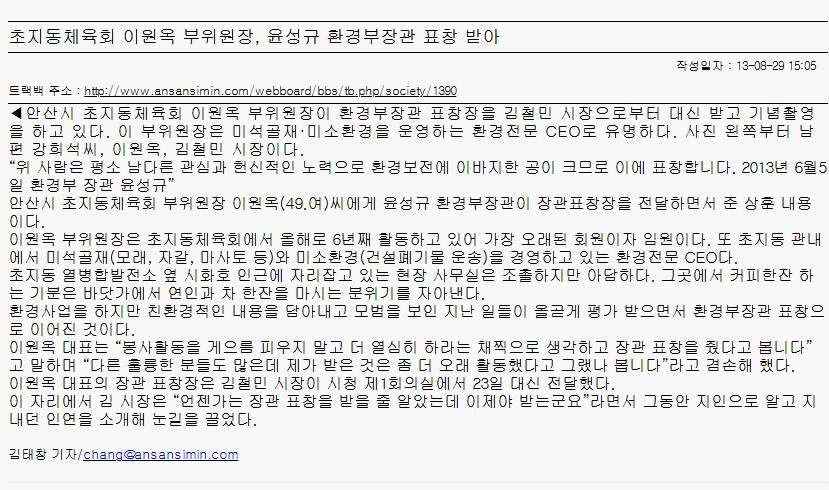 초지동체육회 이원옥 부위원장, 윤성규 환경부장관 표창 받아(08.29)